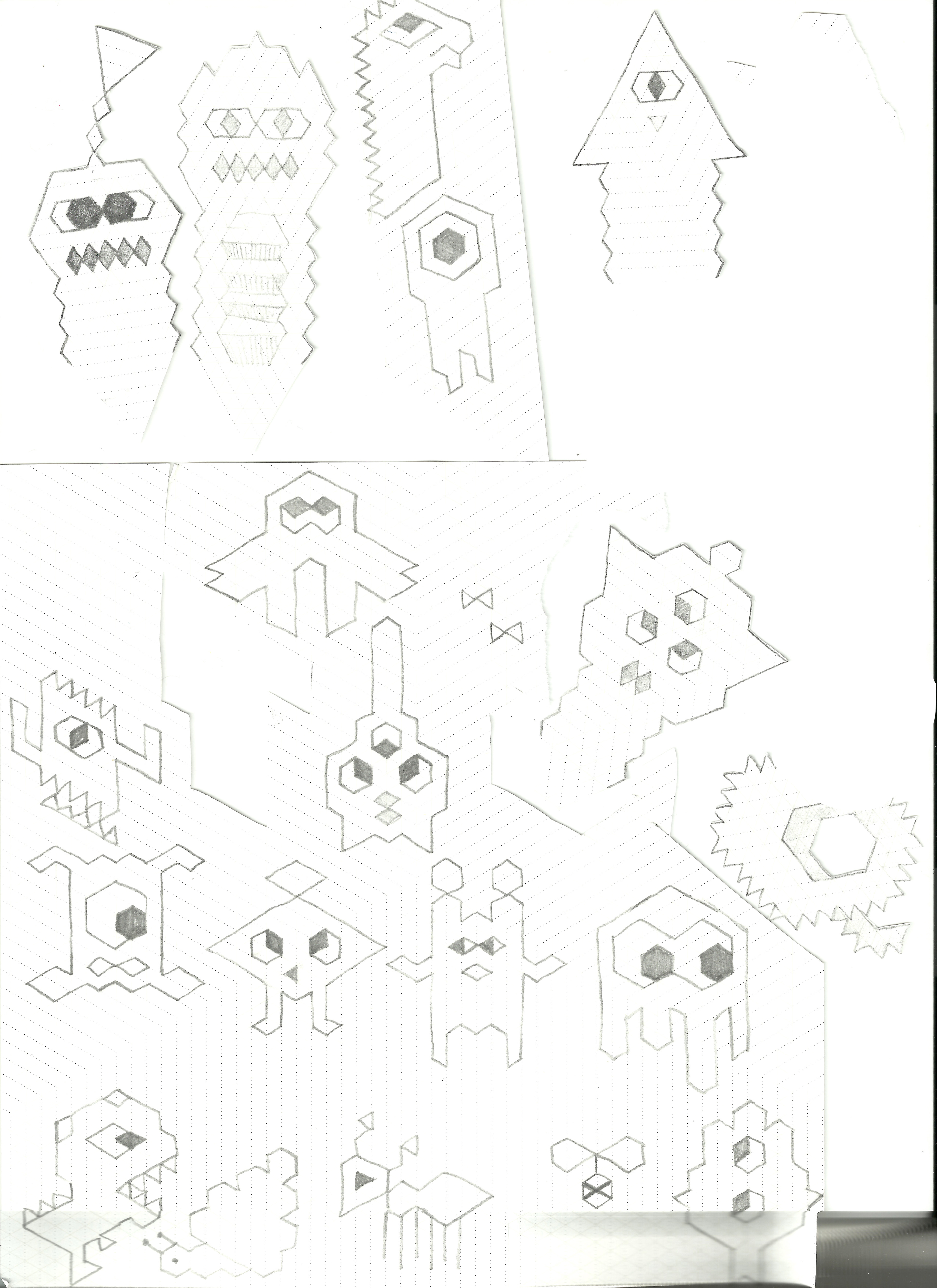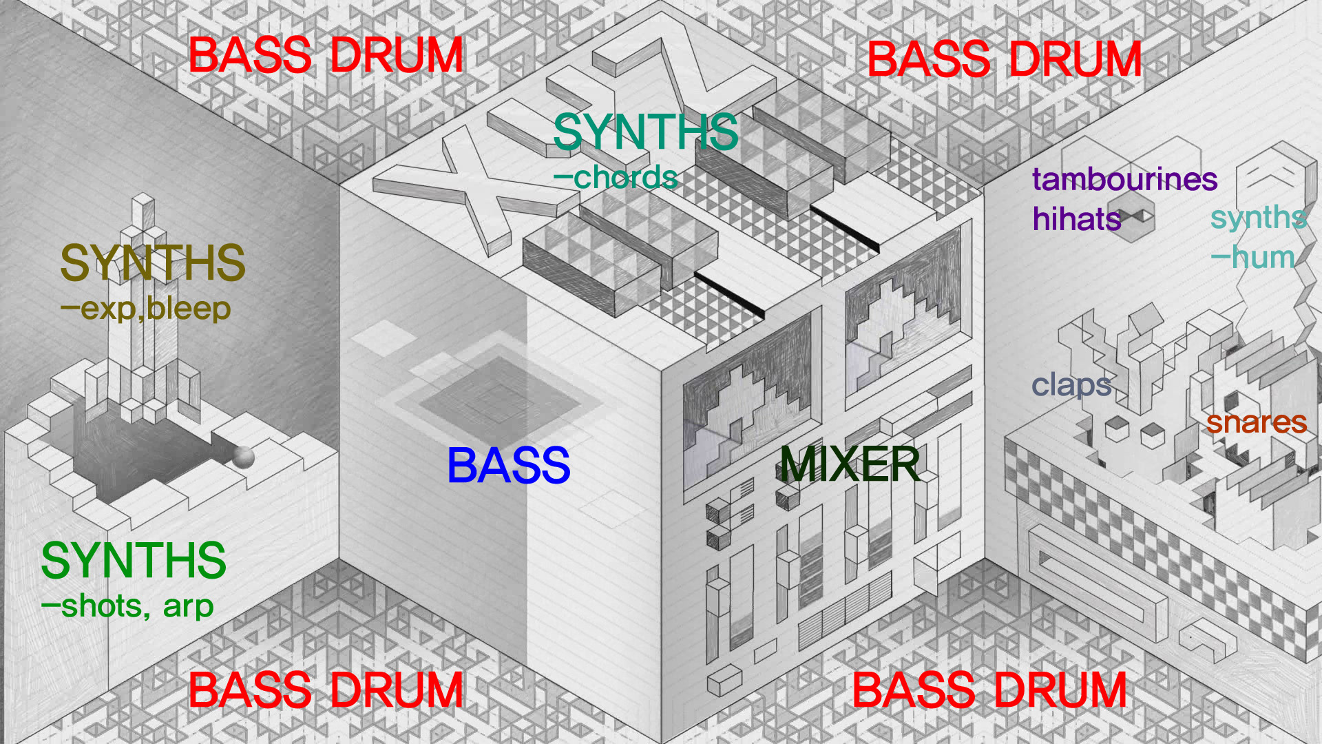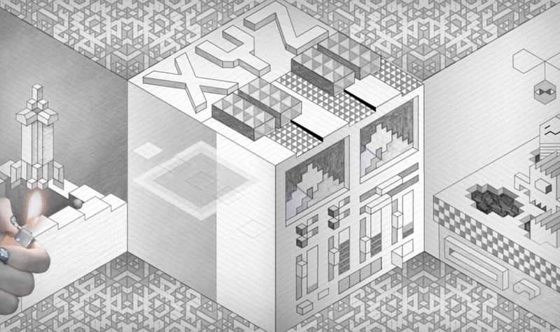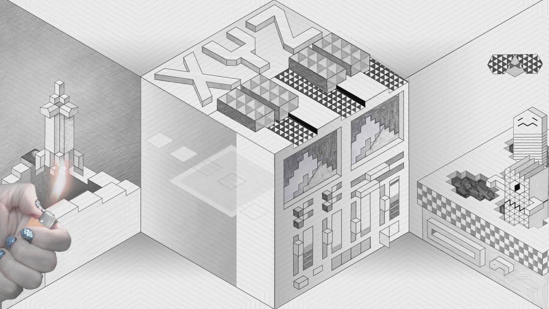 이 작품은 디자인 스튜디오 '깜깜', 뮤지션 '로보토미'님과의 콜라보레이션 프로젝트 입니다.디자인 스튜디오 깜깜은 평범한 사각형 그리드가 아닌, XYZ축 투시 그림을 그리기 좋은 삼각격자 노트를 개발하였습니다. 그들은 그 노트가 크리에이티브한 작업을 하는 사람들에게 유용할 것이라고 생각했기에, 그 노트를 홍보하는 목적으로 이 콜라보레이션 프로젝트를 기획하였습니다.